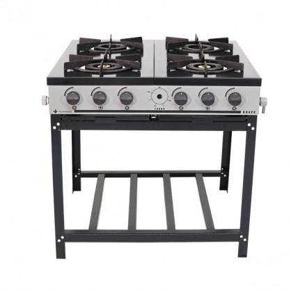 Queimadores de alto rendimento, em ferro fundido, sendo 2 triplo na frente e 2 duplo atrás com potência de 3.773kcal/h.