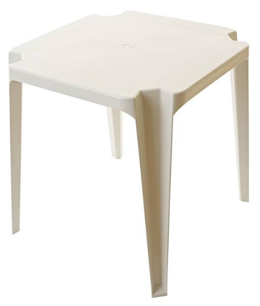 É uma mesa quadrada, monobloco empilhável, muito prática faz